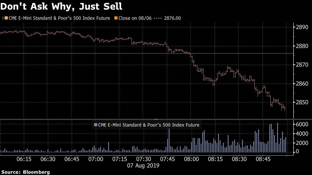 S&P 500 e-mini futures were higher by 0.2% at 2,881 at 7:40 a.m. in New York, before trading activity jumped out of nowhere five minutes later. The contracts turned negative at 8 a.m., and extended declines to as much as 1.8% after the regular open of markets. They were down 0.9% at 10:21 a.m.