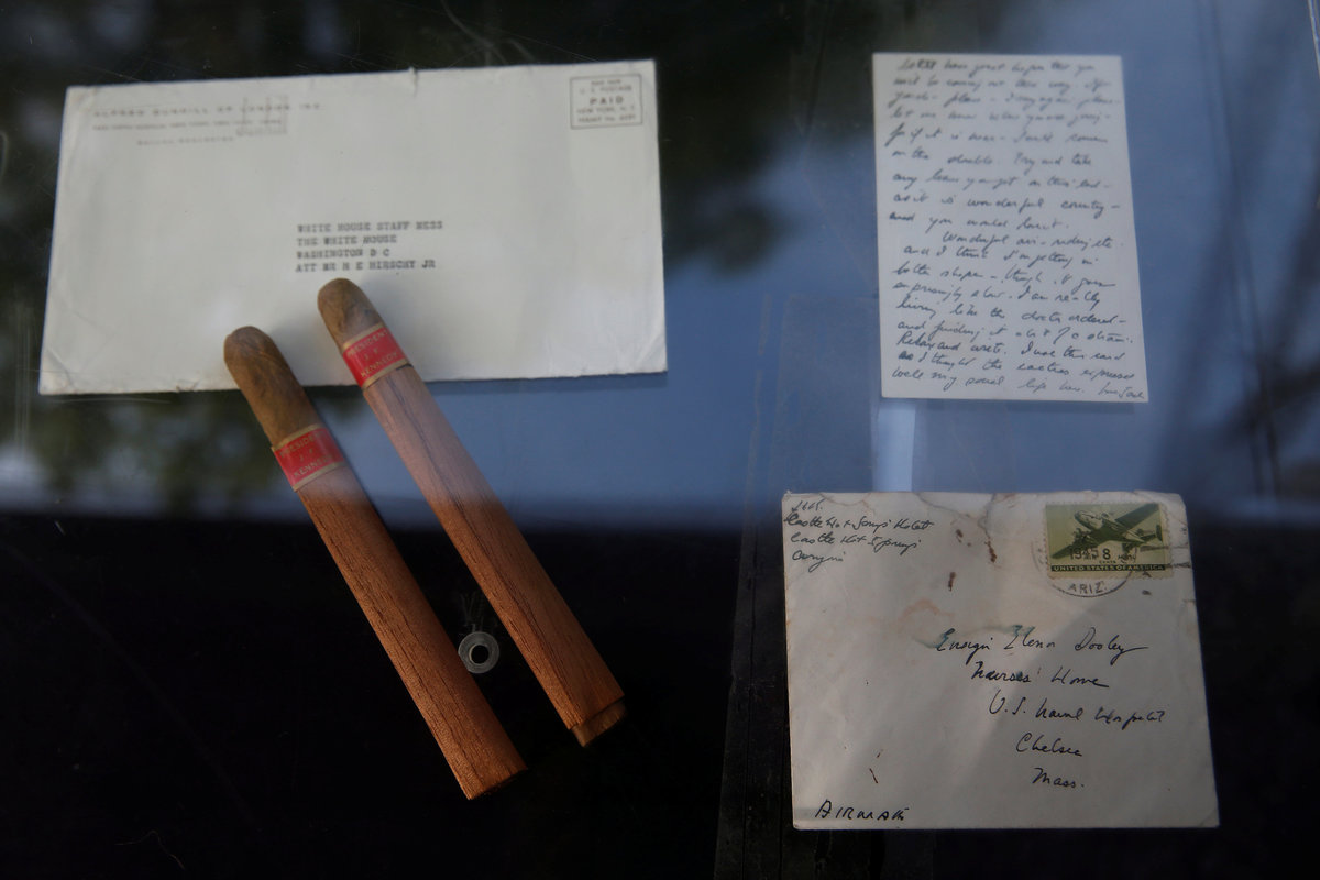 A bomber jacket with the presidential patch bought to replace the fraying one Kennedy often wore is also being sold, along with a draft of a letter to former British Prime Minister Winston Churchill, with hand-written notations, offering to name a Polaris submarine after him.