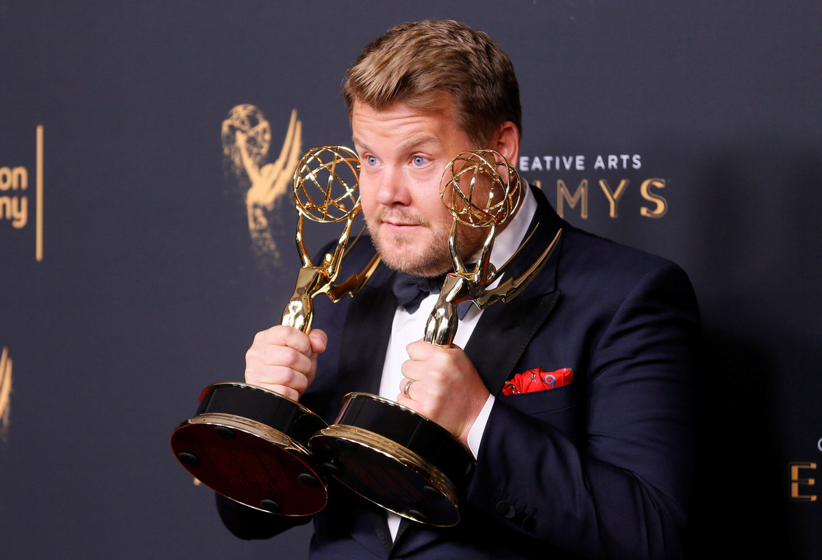 Host James Corden poses with his two Emmy Awards for Outstanding Special Class Program for "70th Annual Tony Awards" and Outstanding Variety Special for "Carpool Karaoke" backstage at the 2017 Creative Arts Emmy Awards in Los Angeles, California, U.S. September 9, 2017. REUTERS/Danny Moloshok