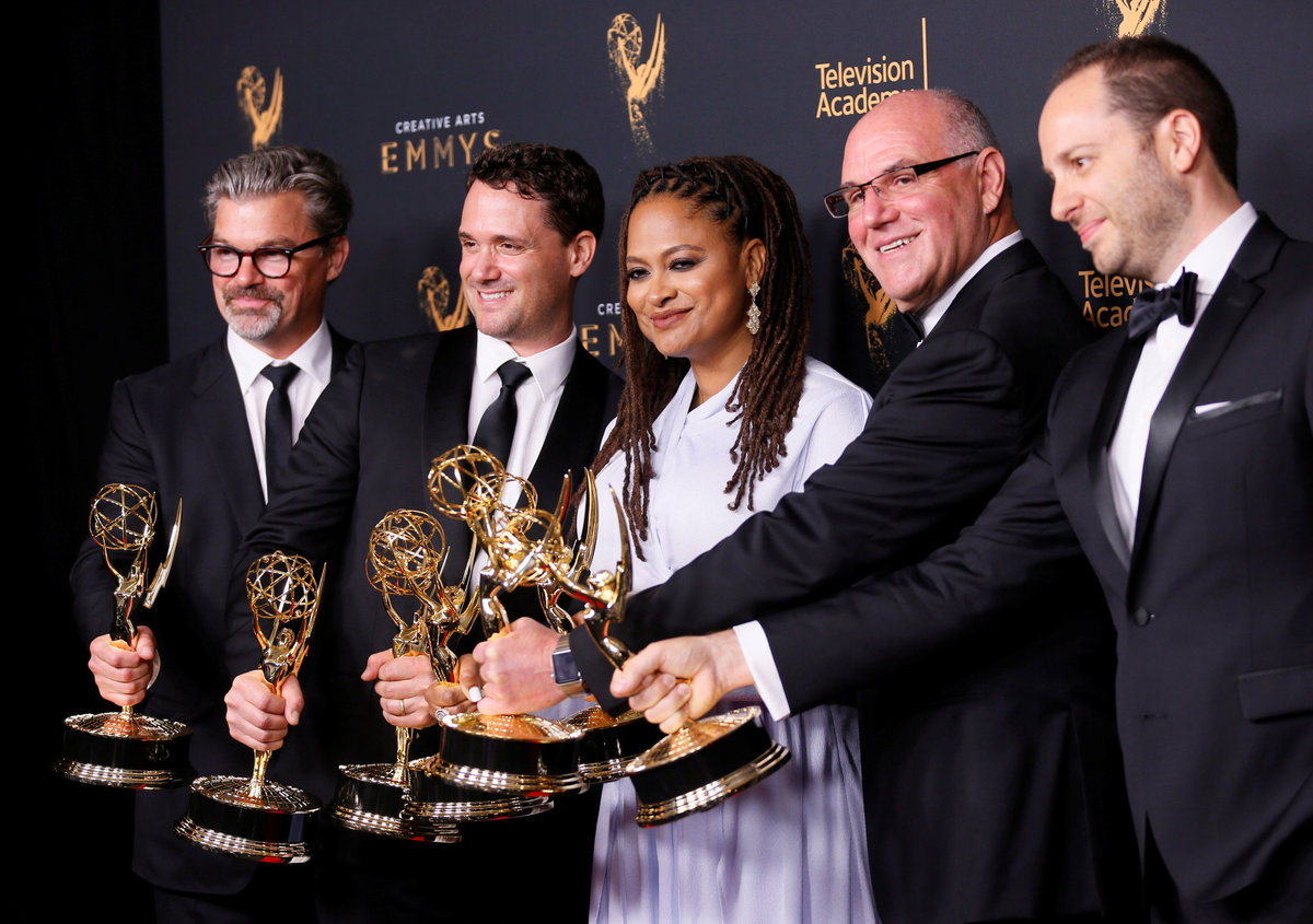 Producer Ava DuVernay (C) poses with her two Emmy Awards for Outstanding Documentary or Nonfiction Special and Outstanding Writing for a Nonfiction she won for "13th" along with others backstage at the 2017 Creative Arts Emmy Awards in Los Angeles, California, U.S. September 9, 2017. REUTERS/Danny Moloshok