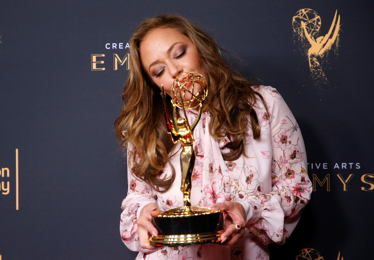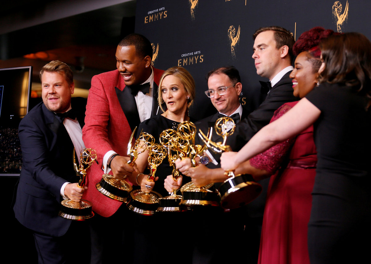 Host James Corden (L) holds an Emmy Award for Outstanding Variety Special for "Carpool Karaoke" as he jokingly jumps into a photo to pose with Samantha Bee (3rd-L) and the other winners from "Full Frontal With Samantha Bee Presents Not The White House Correspondents" for Outstanding Writing for a Variety Special backstage at the 2017 Creative Arts Emmy Awards in Los Angeles, California, U.S. September 9, 2017. REUTERS/Danny Moloshok TPX IMAGES OF THE DAYLeah Remini holds her Emmy Award for Outstanding Informational Series Or Special for " "Leah Remini: Scientology And The Aftermath" backstage at the 2017 Creative Arts Emmy Awards in Los Angeles, California, U.S. September 9, 2017. REUTERS/Danny Moloshok