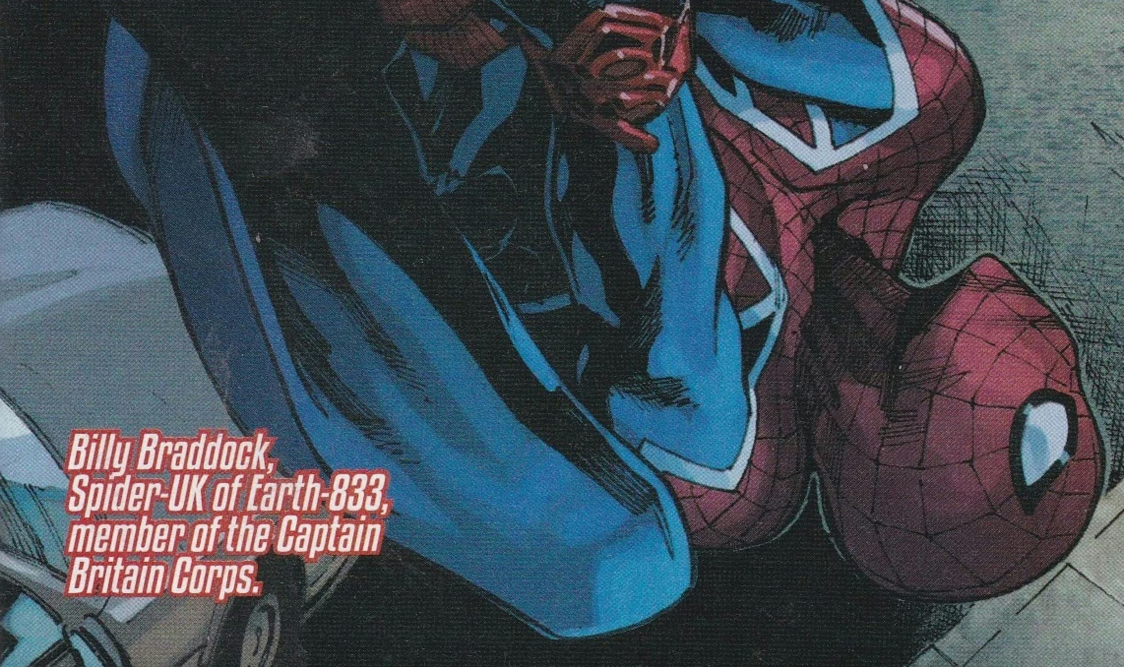 Welcome, William Braddock — Introduced in the comics for the first time in 2014, Billy Braddock is a rookie Captain Britain who, upon learning that an evil family has its sights set on hunting down every Spider-Man in the multiverse, is tasked with helping to protect the remaining web-slingers. Given a talisman that lets him travel freely across the multiverse, Braddock aims to recruit every Spider hero he comes across into one Spider-Army.