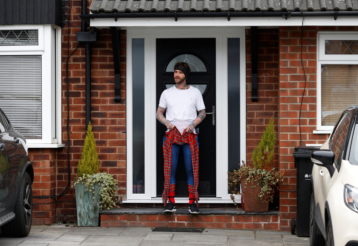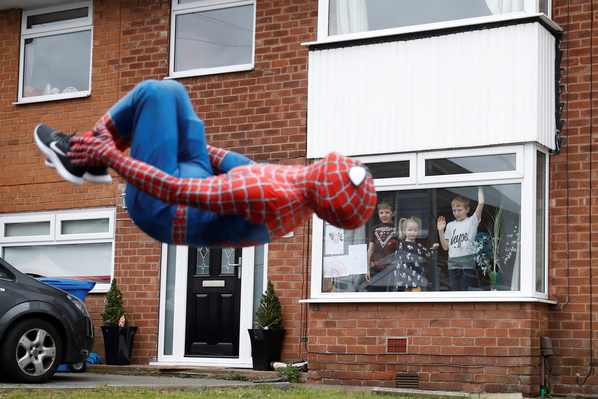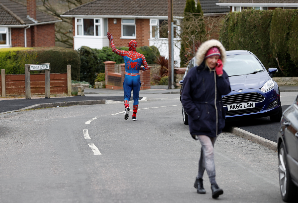 Jason Baird is seen dressed as Spiderman during his daily exercise to cheer up local children in Stockport, as the spread of the coronavirus disease (COVID-19) continues, Stockport, Britain, April 1, 2020. REUTERS/Phil Noble TPX IMAGES OF THE DAY