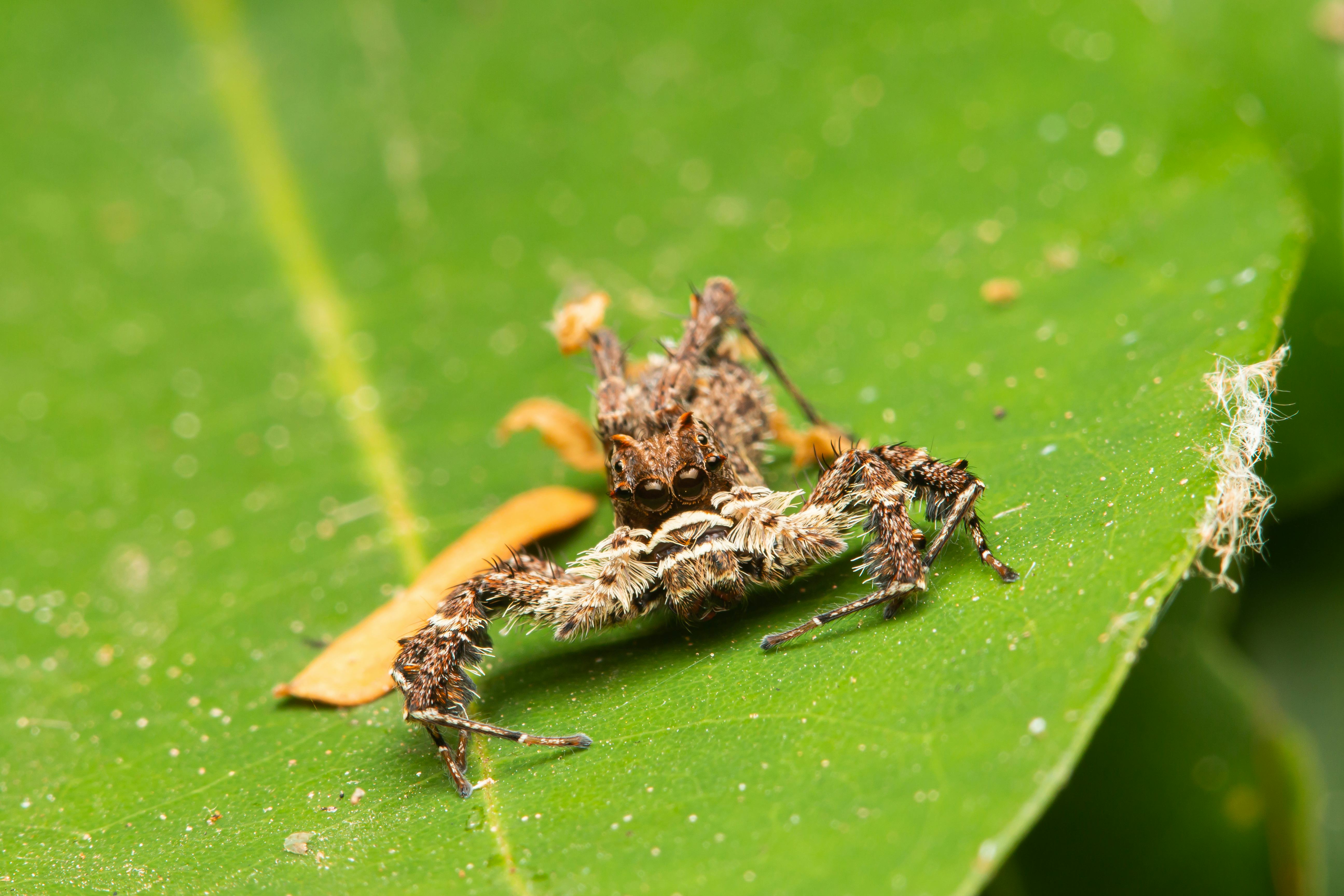 When hunting another group of jumping spiders called Euryattus, Jackson reports, Portia employs a clever trick. Euryattus females build nests in curled-up dead leaves suspended in the air by silk attached to rocks or vegetation. Courting males crawl down the silk suspension ropes, stand on top of the nest and shake it in a specific way. The signal draws the female out of the nest. Portia appears to take advantage of this system by mimicking the male’s shake and luring the female into an ambush.