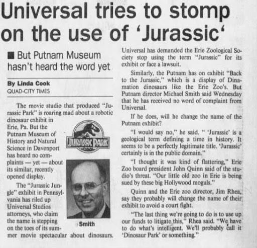 Stunned, Kirkland learned Universal Studios had begun threatening to sue museums that had exhibits with “Jurassic” in the title.