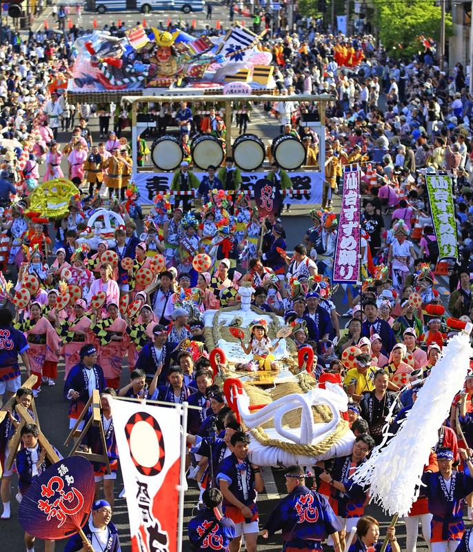 Festival participants in Fukushima carry a 12-meter-long waraji straw sandal, foreground, leading a parade that showcases the major summer festivals from the Tohoku region's six prefectures on Saturday, the first day of the two-day Tohoku Kizuna (bonds) Festival. It was the third holding of the annual event, which was launched as the successor to the Tohoku Rokkon (six souls) Festival that rotated in the region from 2011 to 2016 to express hopes for recovery from the Great East Japan Earthquake.
