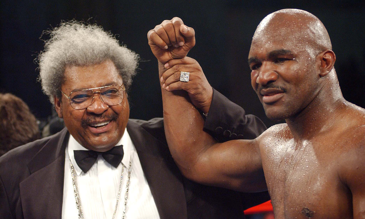 BOXING - Promoter Don King raises the hand of Evander Holyfield after his controversial win against Hasim Rahman in their non-title bout in Atlantic City, New Jersey.