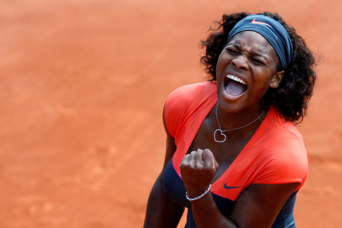 TENNIS - Serena Williams reacts after dismantling Aleksandra Wozniak 6-1 6-2 in their French Open fourth round clash to extend her winning streak in Grand Slams to 18 matches.