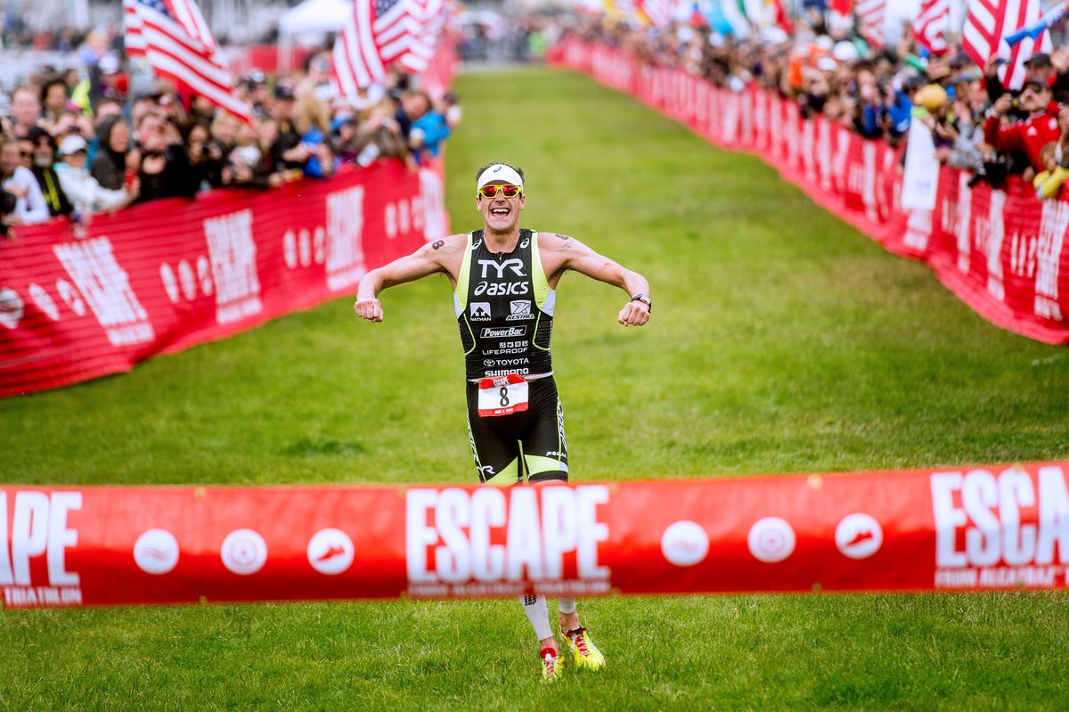 TRIATHLON - United States' Andy Potts celebrates winning the Escape from Alcatraz Triathlon in San Francisco, California.