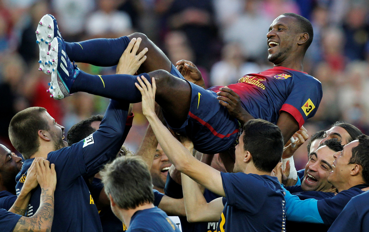 SOCCER - Barcelona defender Eric Abidal is tossed in the air by team mates after the 4-1 victory against Malaga in his last match at the Camp Nou stadium.