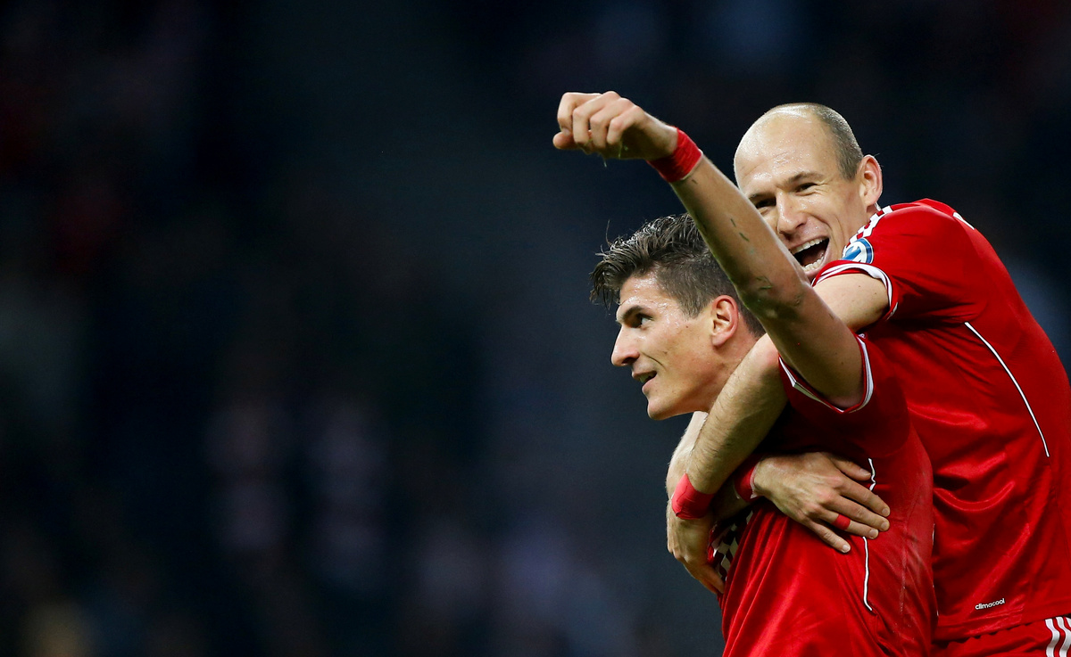 SOCCER - Bayern Munich striker Mario Gomez celebrates with Arjen Robben after scoring against VfB Stuttgart in the German Cup final at the Olympic Stadium in Berlin.