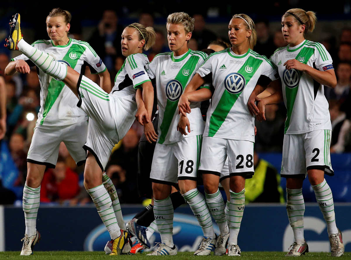 SOCCER - Wolfsburg's Zsanett Jakabfi (2nd L) reacts in the wall during their women's UEFA Champions League final against Olympique Lyon in London.