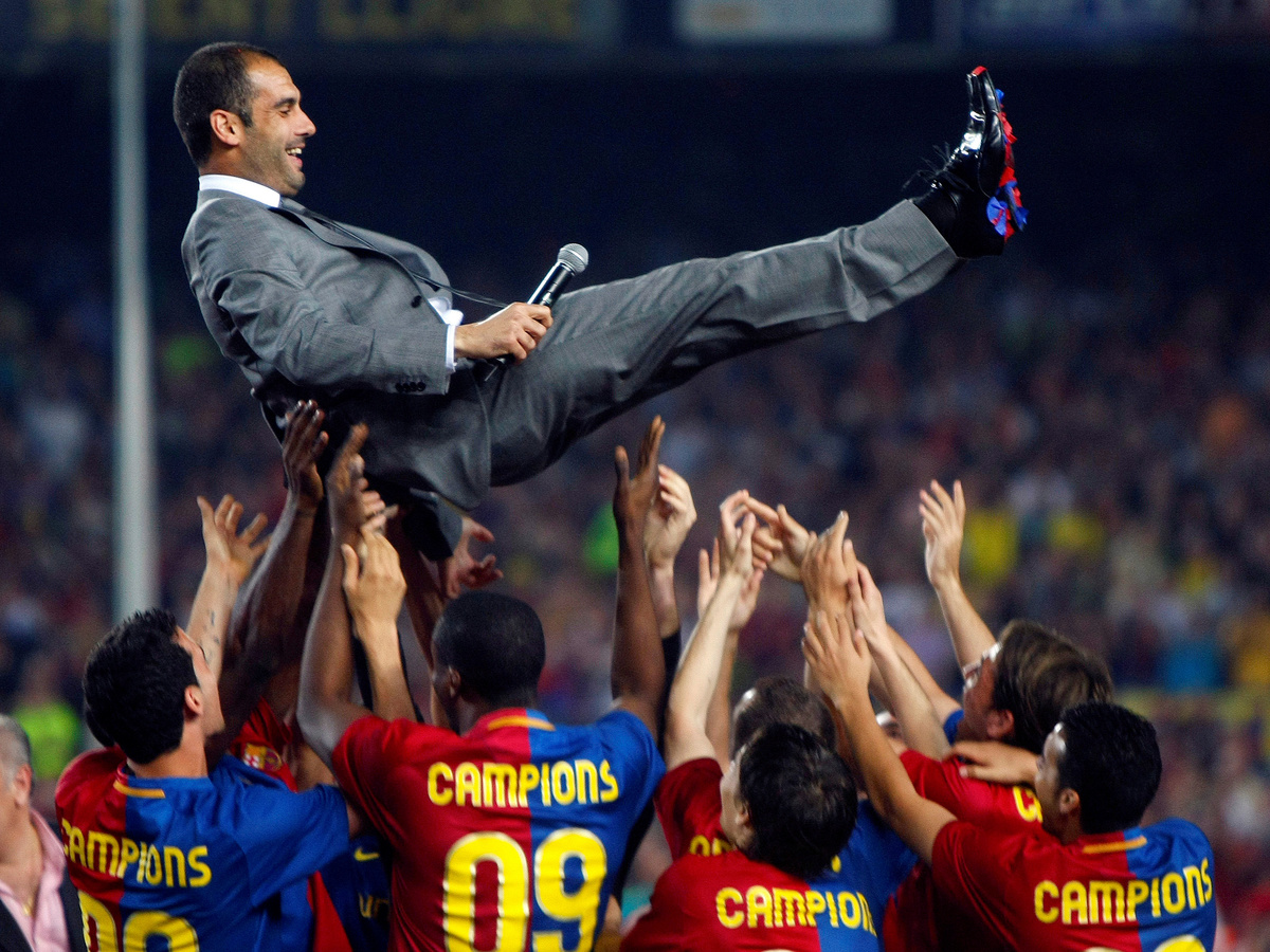 SOCCER - Barcelona coach Pep Guardiola is tossed by players during celebrations of the Spanish La Liga title triumph at Camp Nou stadium.