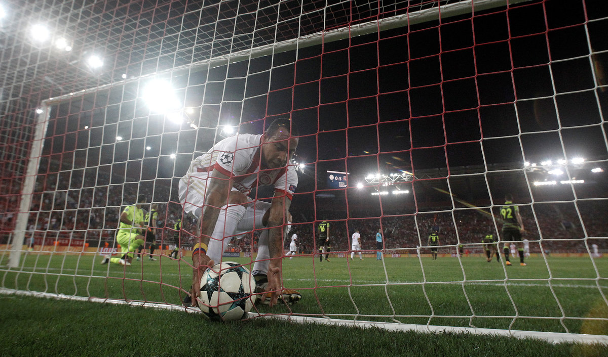 Soccer Football - Champions League - Olympiacos vs Sporting CP - Karaiskakis Stadium, Piraeus, Greece - September 12, 2017 Olympiakos' Filipe Pardo retrieves the ball after scoring their first goal REUTERS/Costas Baltas