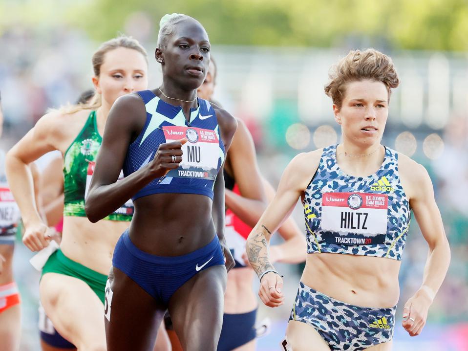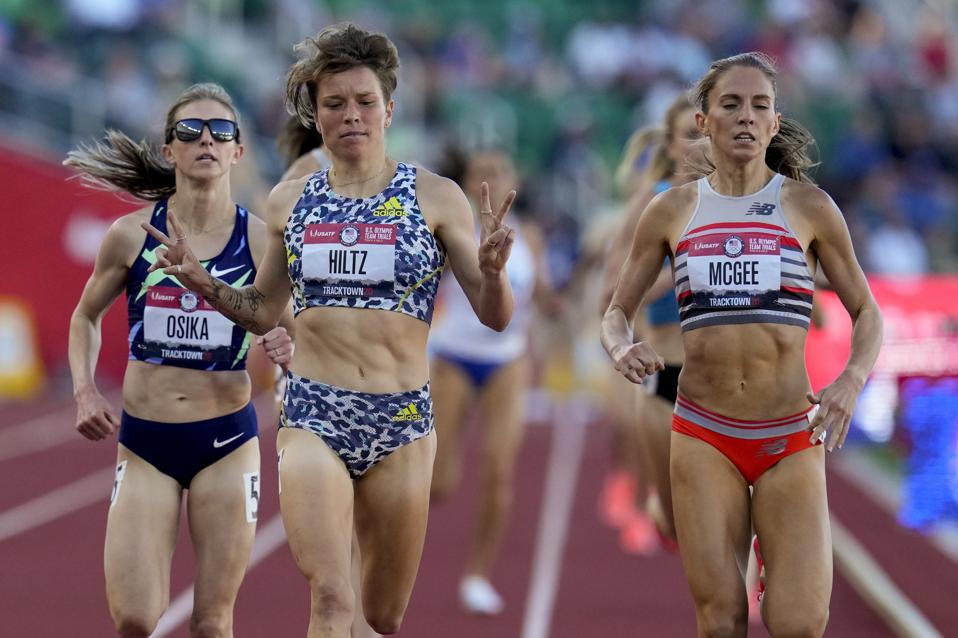 Hiltz flashed peace signs with their hands as they crossed the finish line in the 1500-meter semifinal race at the U.S. Olympic Track & Field Team Trials in Eugene, Ore. in June.