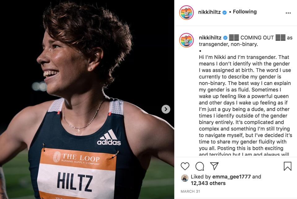 “Six-year-old me expressed my gender identity through having short hair, wearing baseball caps, and refusing to wear dresses,” Hiltz wrote in an op-ed for RunningWorld. “I felt most like myself when I was playing football with the boys during recess, when my dad called me Nick instead of Nikki, and when the substitute teachers would mistake me for a boy.”