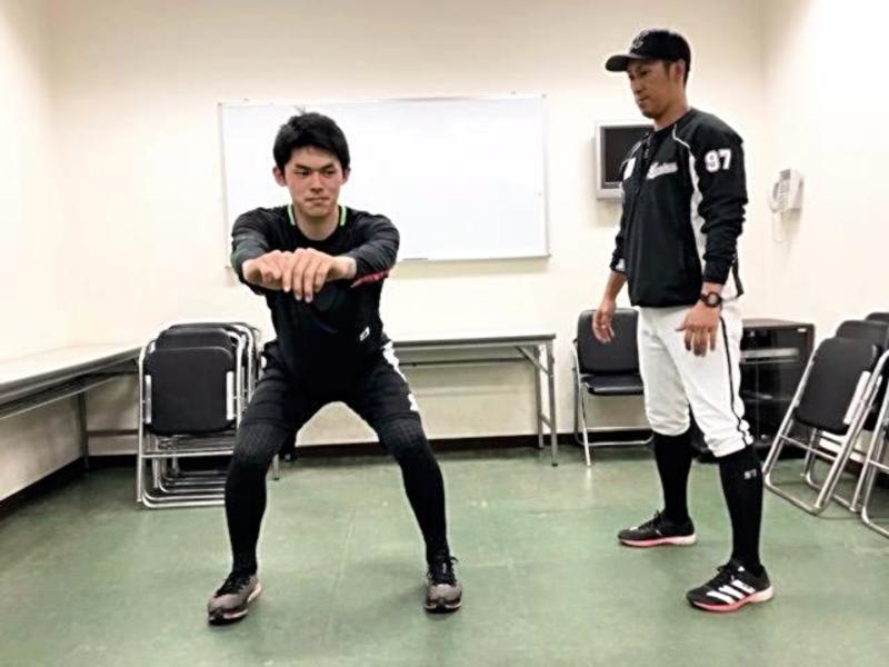 Chiba Lotte's Roki Sasaki, left, stars in a training video the pro baseball team uploaded online.