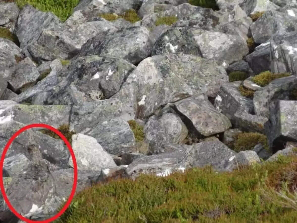 The bird can be seen sitting on a rock at the bottom left side of the image, perfectly blending with the rocks.