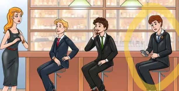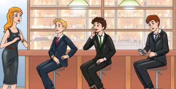 In the provided image, a woman is depicted in search of her husband, while three men are seated on the right side, all appearing eager to claim the role of the rightful partner. Can you discern, from among these three men, who might be her husband?