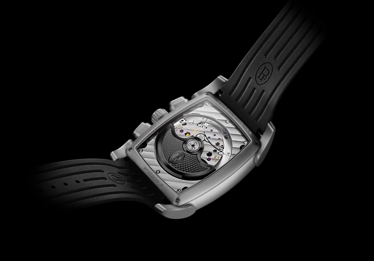 The design recalls a car radiator grille while revealing the tonneau-shaped movement. The integrated chronograph -- unlike the modular kind -- is a complication that few watchmakers in the world have mastered on an industrial scale.
