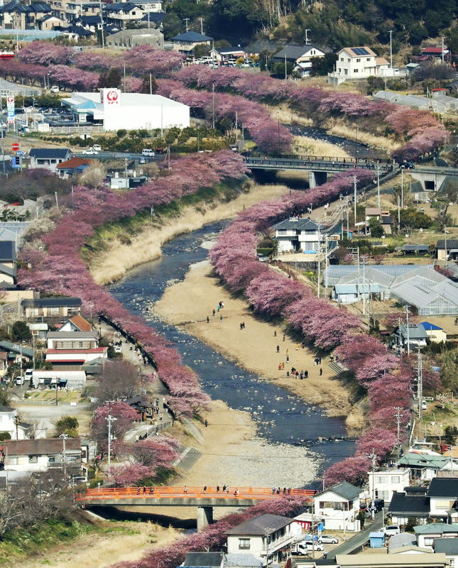 About 850 Kawazu-zakura cherry trees at the peak of their beauty line both sides of the Kawazu River in Kawazu, Shizuoka Prefecture, in this aerial photo taken Tuesday morning from a Yomiuri Shimbun helicopter. Known for blooming early, the trees blossomed about two weeks later than usual this year due to sustained cold temperatures. Visitors will likely be able to enjoy the blossoms until early March, according to the local tourism association.