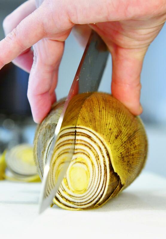 1. Cut off the very tips and roots of bamboo shoots. With the leafy covering on, make one vertical incision in one side of each bamboo shoot.