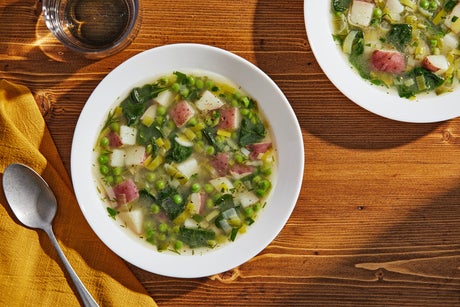 Feel free to vary the vegetables based on what you have on hand, swapping onion for the leeks, parsnips or carrots for the potato, or using snow peas, baby kale, and basil for the green vegetables and herbs, for example.