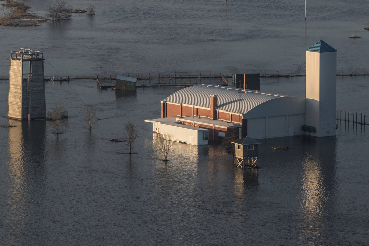 Floodwater climbed up the sides of buildings at Camp Ashland, an Army National Guard facility in Ashland, Nebraska.