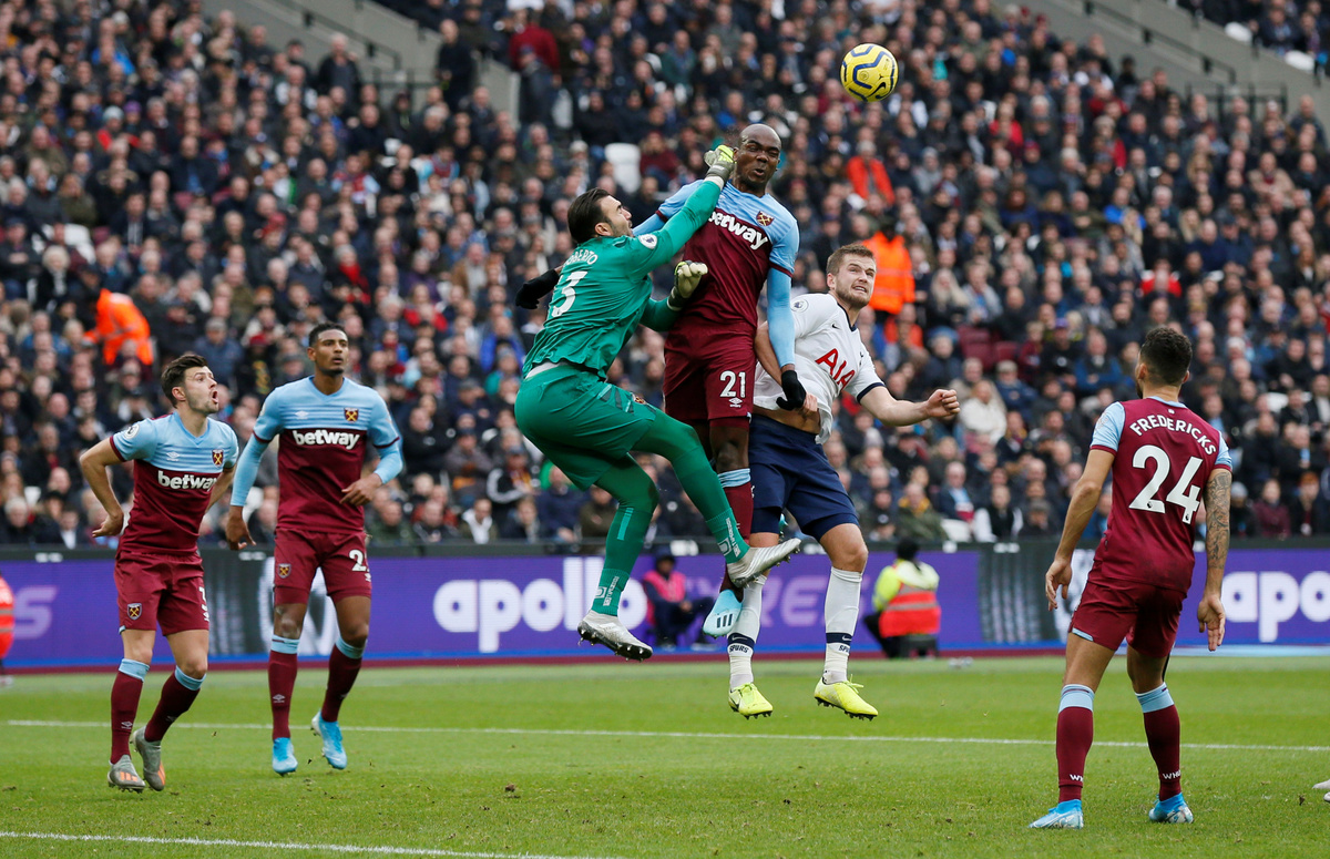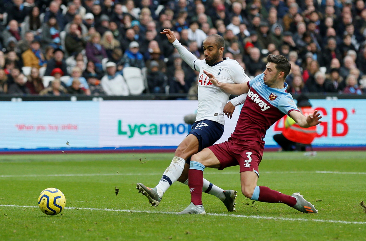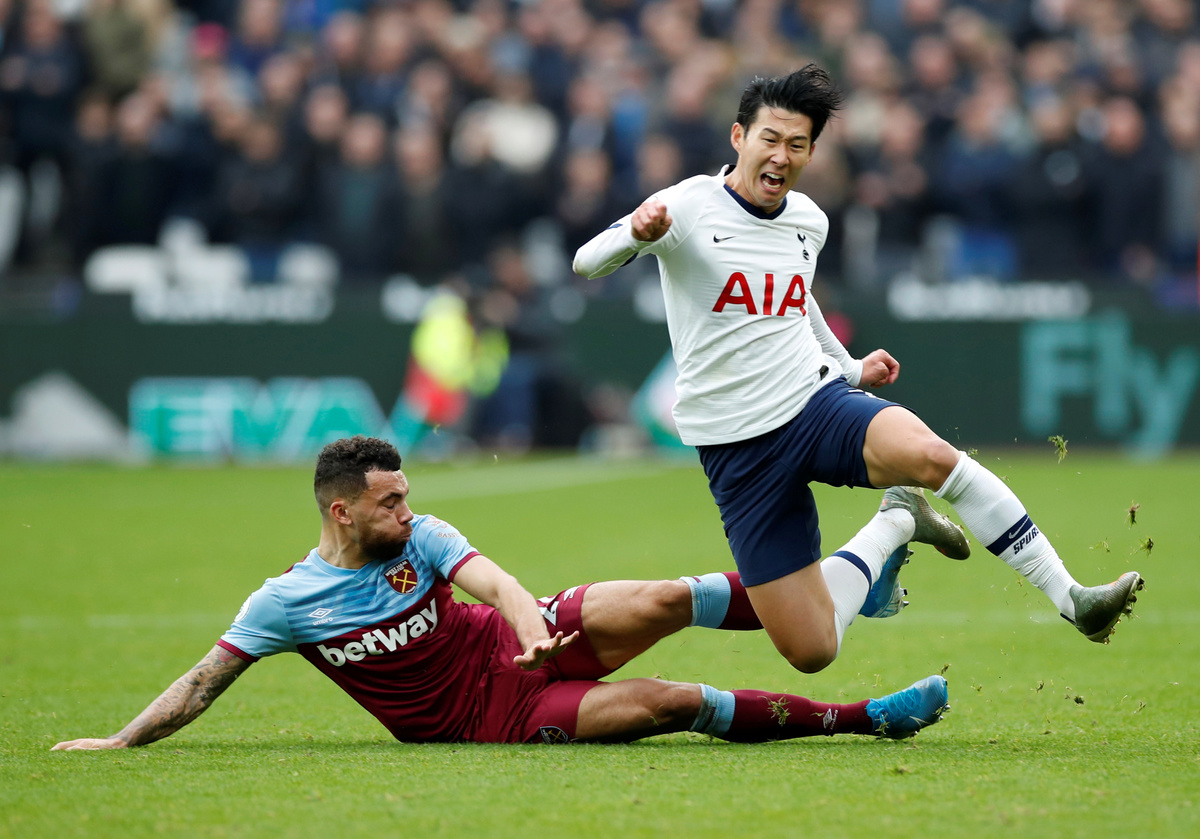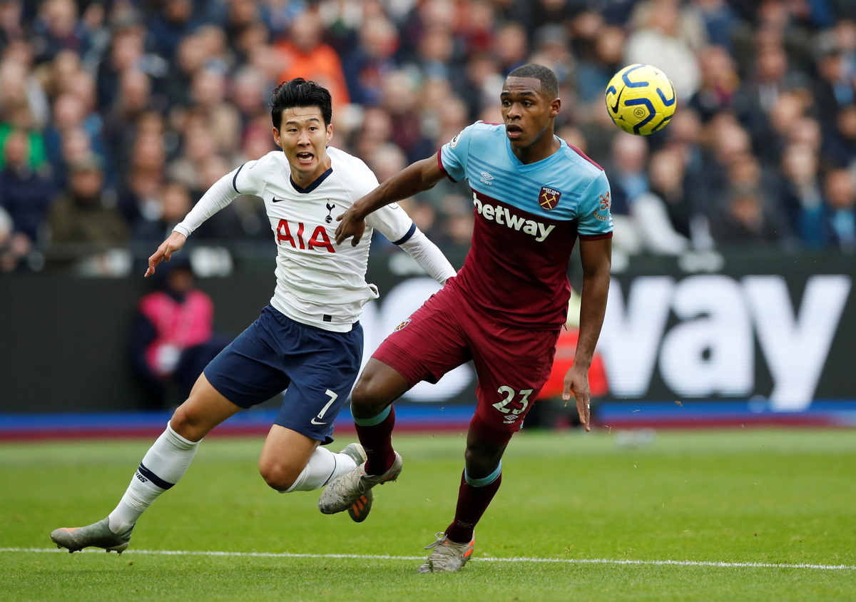 Soccer Football - Premier League - West Ham United v Tottenham Hotspur - London Stadium, London, Britain - November 23, 2019 West Ham United's Ryan Fredericks fouls Tottenham Hotspur's Son Heung-min REUTERS/David Klein Soccer Football - Premier League - West Ham United v Tottenham Hotspur - London Stadium, London, Britain - November 23, 2019 Tottenham Hotspur's Son Heung-min in action with West Ham United's Issa Diop REUTERS/David Klein Soccer Football - Premier League - West Ham United v Tottenham Hotspur - London Stadium, London, Britain - November 23, 2019 Tottenham Hotspur manager Jose Mourinho and West Ham United manager Manuel Pellegrini REUTERS/David Klein Soccer Football - Premier League - West Ham United v Tottenham Hotspur - London Stadium, London, Britain - November 23, 2019 Tottenham Hotspur's Lucas Moura and Harry Winks in action with West Ham United's Issa Diop REUTERS/David Klein Soccer Football - Premier League - West Ham United v Tottenham Hotspur - London Stadium, London, Britain - November 23, 2019 Tottenham Hotspur's Davinson Sanchez in action with West Ham United's Roberto and Sebastien Haller REUTERS/David Klein Soccer Football - Premier League - West Ham United v Tottenham Hotspur - London Stadium, London, Britain - November 23, 2019 West Ham United's Mark Noble in action with Tottenham Hotspur's Dele Alli REUTERS/David Klein