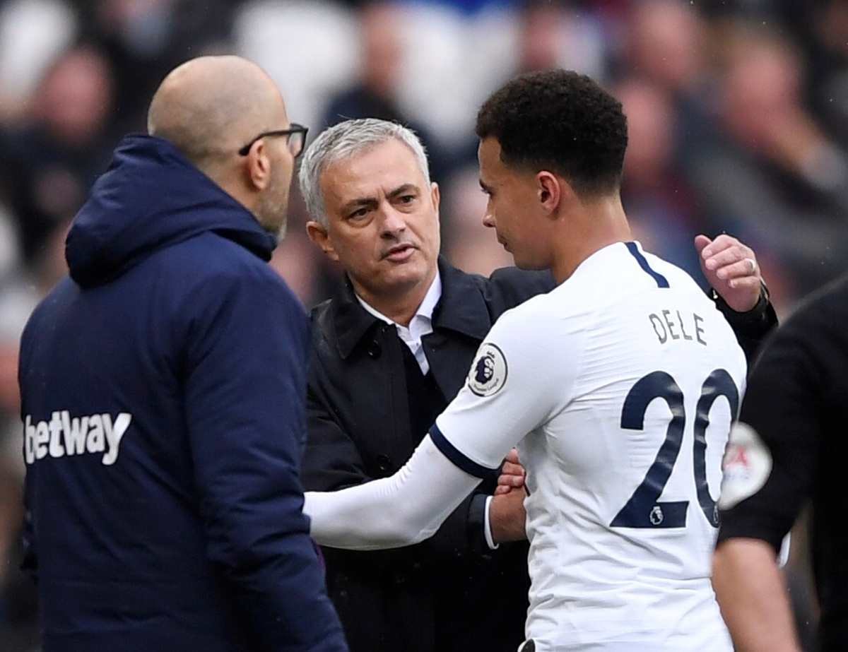 Soccer Football - Premier League - West Ham United v Tottenham Hotspur - London Stadium, London, Britain - November 23, 2019 Tottenham Hotspur's Dele Alli speaks with Tottenham Hotspur manager Jose Mourinho after he is substituted off Action Images via Reuters/Tony O'Brien