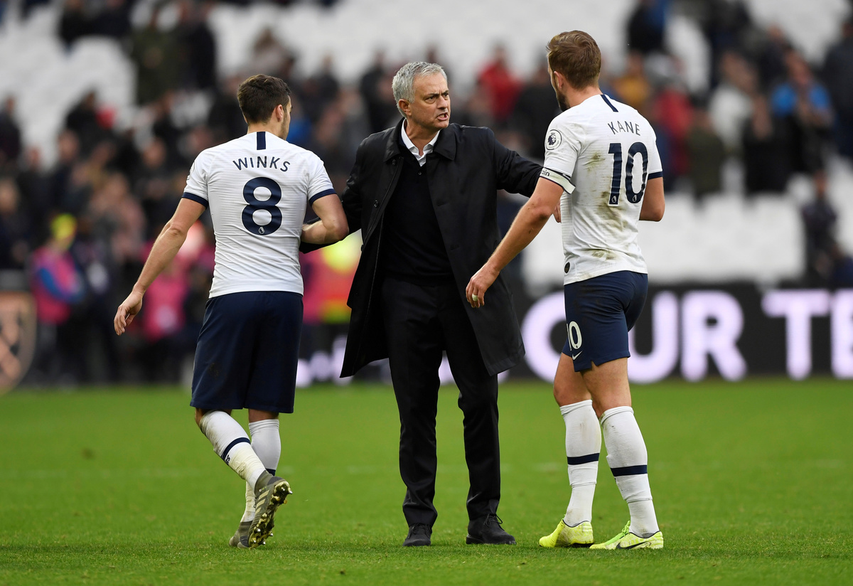 Soccer Football - Premier League - West Ham United v Tottenham Hotspur - London Stadium, London, Britain - November 23, 2019 Tottenham Hotspur manager Jose Mourinho speaks with Tottenham Hotspur's Harry Kane and Harry Winks after the match Action Images via Reuters/Tony O'Brien
