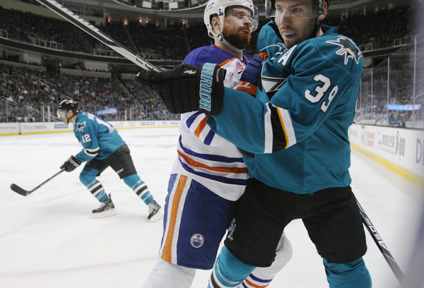 With Joe Thornton back in the lineup, the Sharks were relentless in the first period when they were credited with an astonishing 32 hits and outshot the Oilers 13-6.