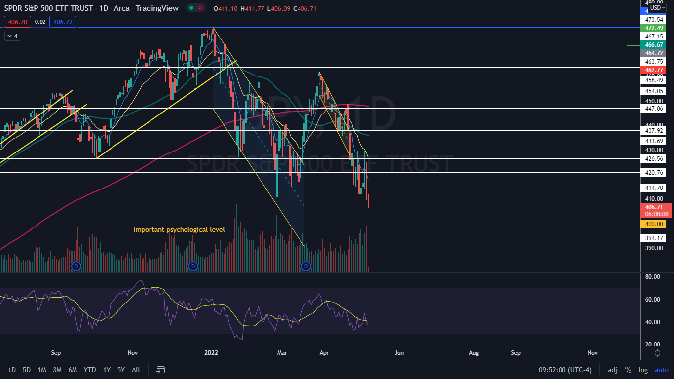 The SPY Chart: The SPY has been trading in a fairly consistent downtrend since March 29, when the ETF topped out at the $462.07 level. The most recent lower high was printed on Wednesday at $429.66, and the most recent confirmed lower low was formed at the $405.02 level on May 2.