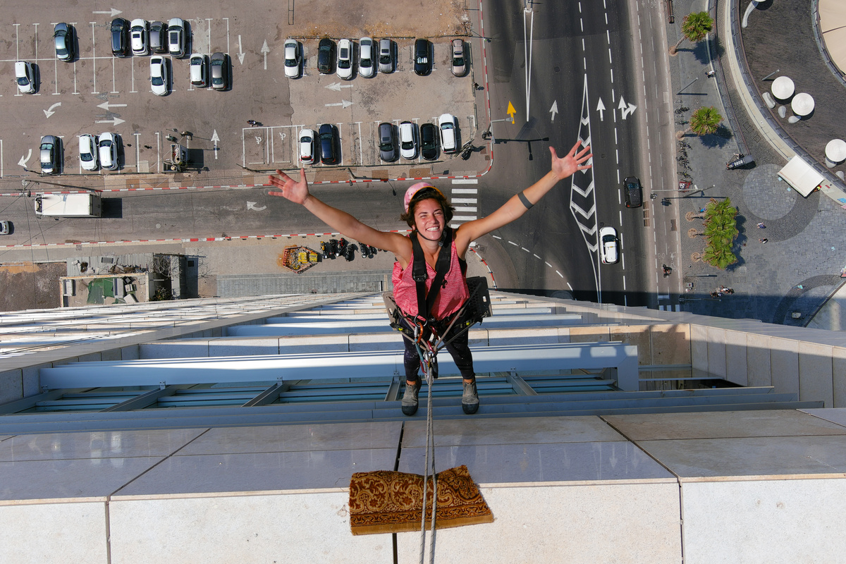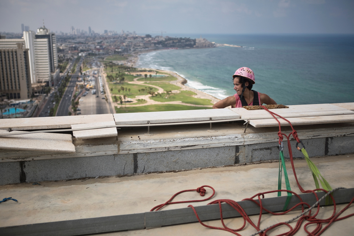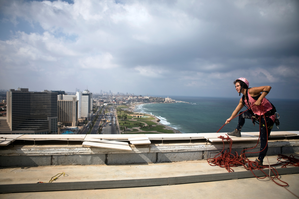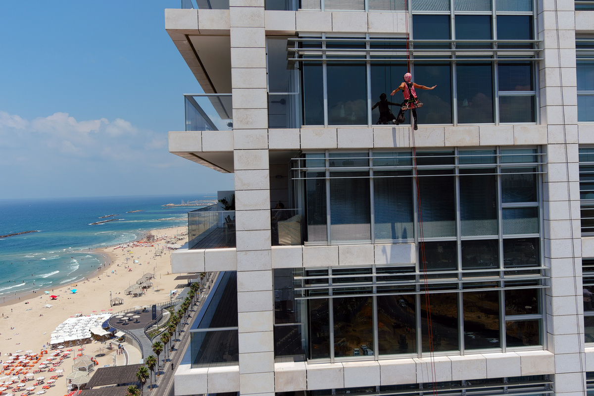 Noa Toledo, 22-year-old window washer and rising social-media star in Israel, poses for a picture while rappelling to clean the facade of a high-rise building in Tel Aviv, Israel August 5, 2020. Picture taken with a drone. REUTERS/Ilan RosenbergNoa Toledo, 22-year-old window washer and rising social-media star in Israel, looks on as she rappels to clean the facade of a high-rise building in Tel Aviv, Israel August 5, 2020. REUTERS/Nir Elias