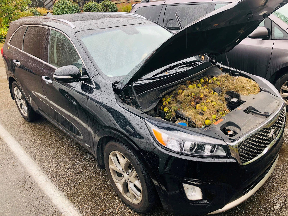 Holly opened the hood to find an engine full of walnuts neatly packed in grass, presumably stored there by squirrels over the weekend, when the vehicle had been parked in the open.