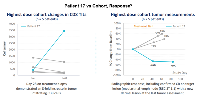 Patient 17 showed outsized presence of CD8+ tumor infiltrating lymphocytes (TILs) versus other members of the highest dose cohort. Similarly, Patient 17 demonstrated a marked decrease in the tumor as evidenced by radiography, including confirmed Complete Response on target lesion. Patient 17 was diagnosed 3.7 years prior to SQZ therapy with six prior lines of systemic therapy including carboplatin/Fluorouracil (5FU)/pembrolizumab and anti-TGFβ/pembrolizumab (best overall response of progression of disease) nine months before SQZ-PBMC-HPV dosing. He received all seven doses of SQZ-PBMC-HPV with excellent tolerability. Dysphagia and neck swelling improved and physical examination of the lesion also improved.