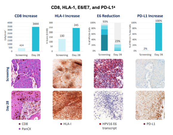 In addition to the enhanced CD8+ presence within the tumor, which is associated with positive prognostic value,5 Patient 17 demonstrated increase in HLA-1, reduction in E6/E7 (target antigen) and increase in PD-L1 which suggest potential synergy with a combination approach. PD-L1 acts as a brake, tempering the body's immune response, which is undesirable in this therapeutic application. Thus, use of SQZ-PBMC-HPV in combination with a PD-L1 blockade agent could augment therapeutic efficacy even further.