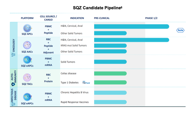 SQZ is pursuing HPV+ cancer based on the unmet need in a global disease. HPV+ cancers are also well-studied, providing standardized markers of success for the company's work. HPV+ tumors in patients that are HLA-A*02+ have been extensively researched and there are many known biomarkers that can be leveraged to assess therapeutic activity and monitor patient metrics. Demonstrating efficacy in HPV serves as excellent proof of concept for this novel technology and has applications in multiple solid tumor types. SQZ' candidate is being evaluated in a Phase I study and has licensed certain commercialization rights to Roche. The cells are engineered, autologous peripheral blood mononuclear cells (PBMCs) squeezed with HPV+ solid tumor specific antigens. Squeezing, in contrast to other delivery methods, enables robust MHC-I presentation of the target and drives activation of the patient's endogenous CD8+ T cells against the HPV+ tumor cells.