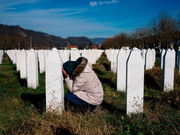 More than 8,000 Muslim Bosniaks were murdered as part of a genocide carried out by units of Bosnian Serb forces under the command of army general Ratko Mladic, known as the Butcher of Bosnia.