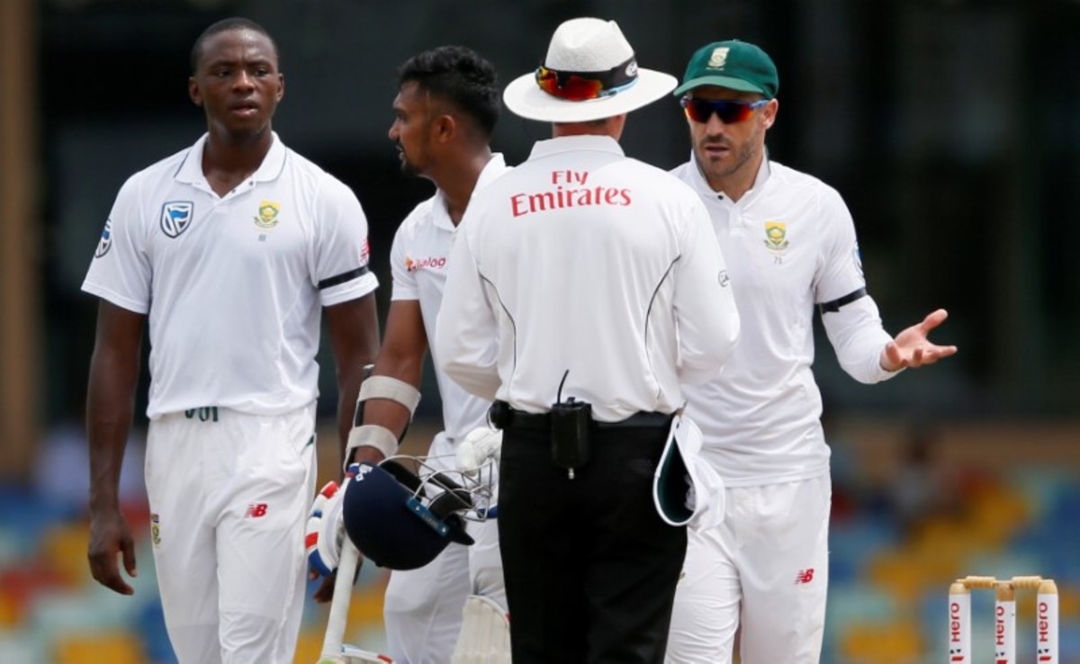 Cricket - Sri Lanka v South Africa -Second Test Match - Colombo, Sri Lanka - July 20, 2018 - South Africa's captain Faf du Plessis (R) and Kagiso Rabada (L) react next to umpire Rod Tucker after the third umpire decision for the unsuccesful LBW wicket for Sri Lanka's Danushka Gunathilaka (2nd L). REUTERS/Dinuka Liyanawatte