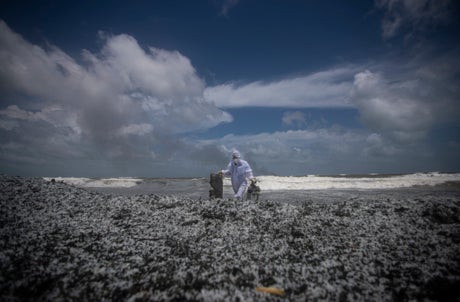 Debris — including several tons of plastic pellets used to make plastic bags — from the burning ship has washed ashore and is causing severe pollution on beaches. The government has banned fishing along about 80 kilometers (50 miles) of the coast.