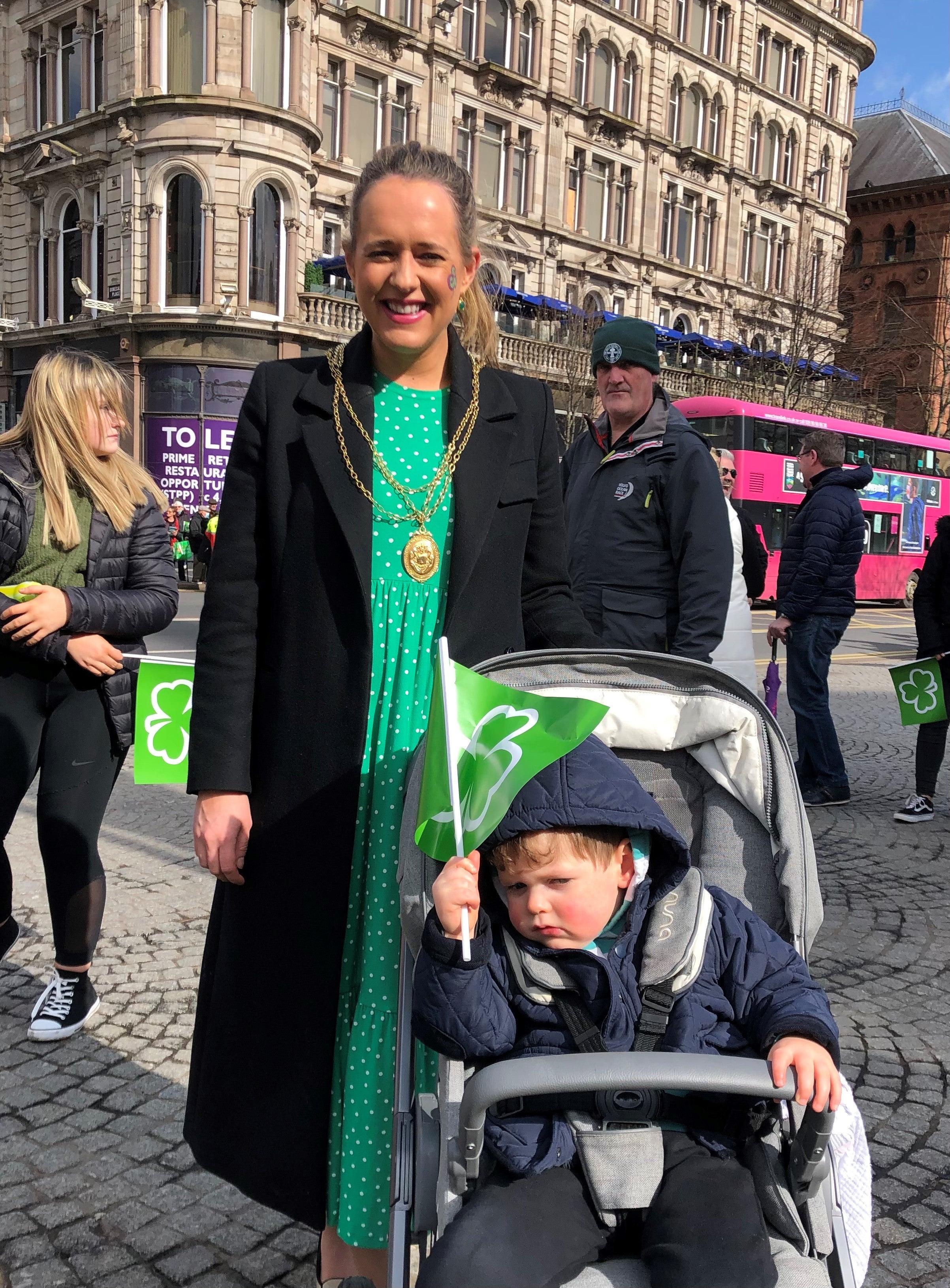 Lord Mayor Ms Nicholl, who is seven months pregnant, pushed her two-and-a-half-year-old son Cian in a pram at the front of the parade.