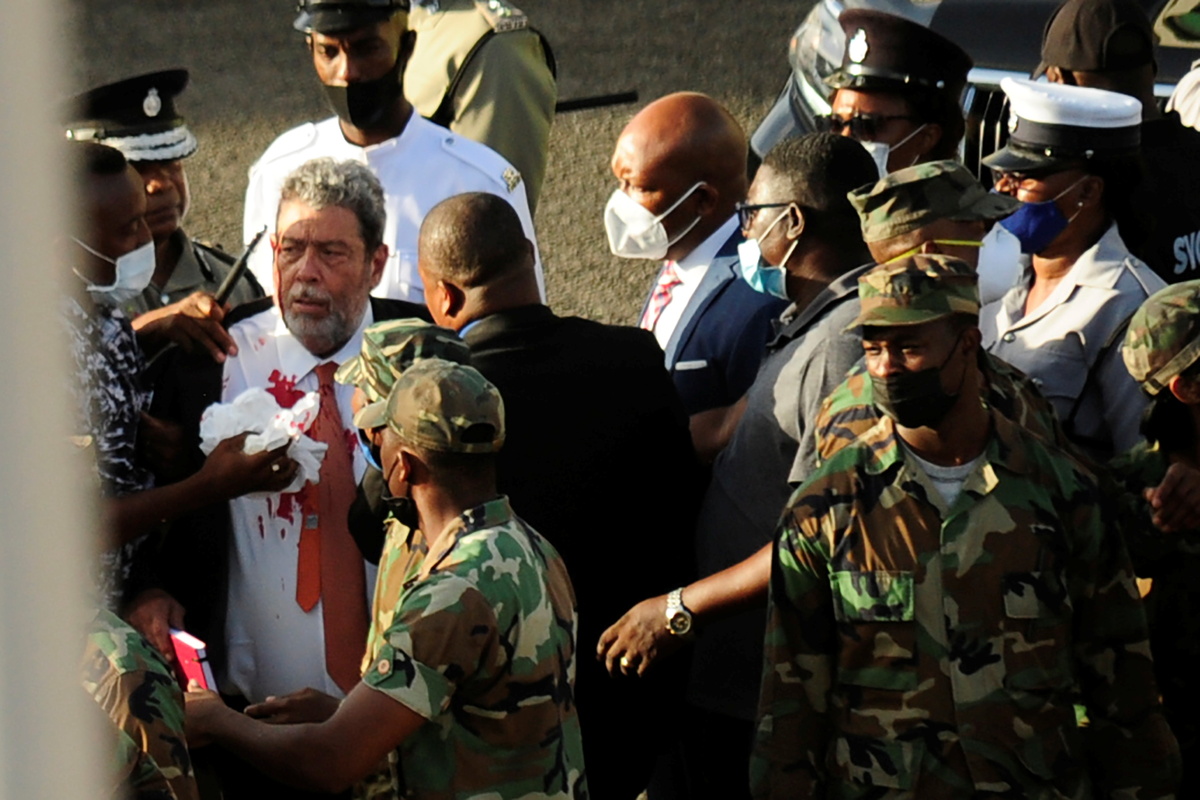 Reuters images show that blood from Gonsalves' head wound had stained his white dress shirt crimson, as an aide held a wad of paper towels to his head.