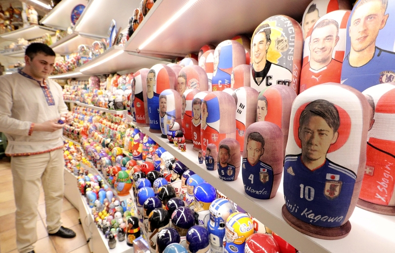 Matryoshka stacking dolls decorated with images of soccer players are showcased at a Moscow souvenir shop ahead of the 2018 FIFA World Cup in Russia. Japan's Samurai Blue is among the teams featured on the wooden doll sets, with Shinji Kagawa portrayed on the largest, 12-centimeter-tall figure, followed by Keisuke Honda, Yuto Nagatomo, Shinji Okazaki and finally a 2-centimeter-tall Makoto Hasebe. Matryoshka dolls depicting the Argentine team are selling well, according to the shop.
