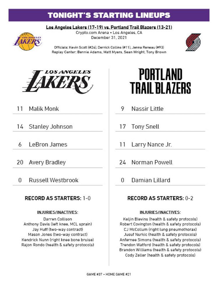 Lakers beat the Blazers 139-106, head into 2022 with an 18-19 record. LeBron season-high 43p on 16-of-26 shooting (5-of-10 from 3) 14r 2s 2b; Westbrook 15p 13r 12a 2s for 4th straight triple-double; Monk 18p; Melo 16p 3b; THT 10p; Stanley Johnson 10p; Austin Reaves 10p – 12:52 AM