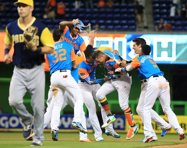 Marlins' colors for the weekend are variations some of their usual colors, a mid-range blue with neon orange sleeves and lettering; the Padres wore dark blue with bright yellow accents.
