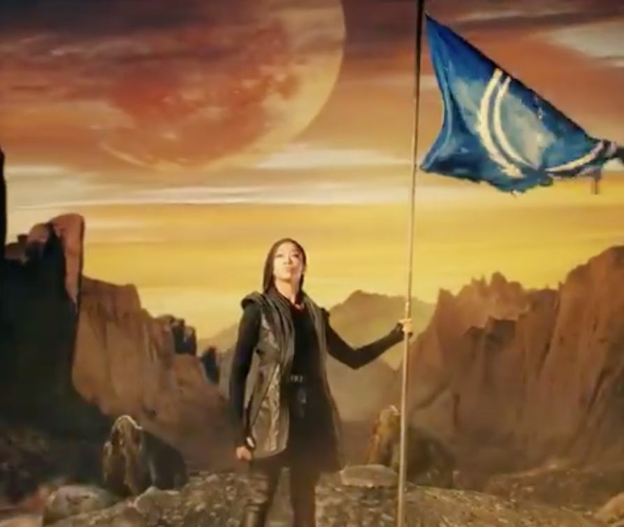 The latest teaser CBS shared on Twitter is brief, clocking in at just 15 seconds. In it, Michael Burnham (Sonequa Martin-Green), grasps a billowing Federation flag amid a desolate, rocky landscape with a yellow and red sky. What appears to be a desolate moon hangs in the distant sky. Burnham isn't wearing a Starfleet uniform, but a dark ensemble with a long leather vest and slim leather trousers. She wears her hair in long braids and her face carries an expression of grim resolve. As the familiar blue flag billows in the background, a title card for the show says "new season coming soon."