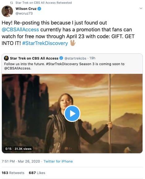 There may be some significance to infer from the end date of April 23. If we had to venture a guess, we'd expect that CBS's tentative plan is to start airing Discovery Season 3 shortly after that trial promotion ends, barring any unforeseen complications in the production schedule. The Discovery showrunners shared a lengthy preview for the upcoming season at New York Comic Con way back in November 2019, and filming officially wrapped in February 2020. It's fair to assume a good chunk of the season is nearly ready for prime time.