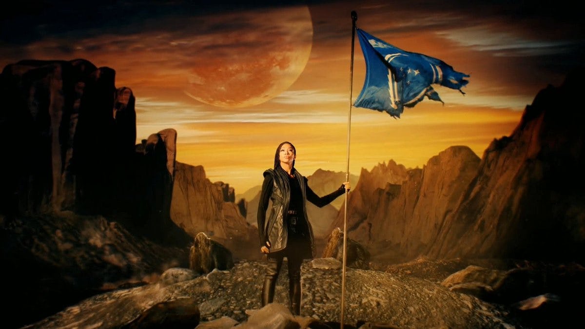 A new character whose name we don't yet know, played by Adil Hussain, appears to be some kind of Federation official. In the trailer, he tells Burnham he's been "waiting" and shows her what we can only assume is the "new" Federation flag. As several fans have pointed out, the number of stars on this future Federation flag is significantly fewer than in the era of The Next Generation, which could prove that a massive rupture led to several planets leaving the organization. Hussain has been hush-hush about his role in Season 3, but it seems clear that he has some answers about what happened to the Federation. It's not totally clear if the Federation does exist, or if Hussian's character is showing Burnham an old flag from the last point that the Federation did exist.