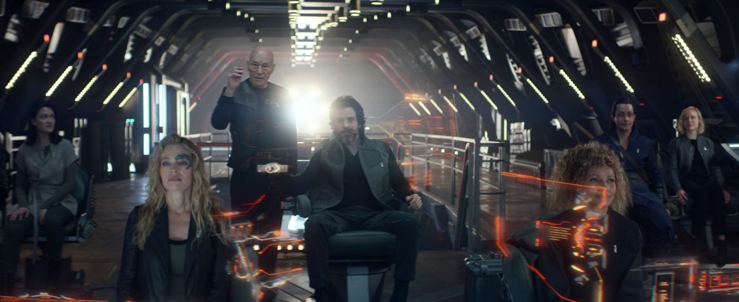 If you've downloaded the Jeff Russo score for Picard Season 1, then you know one of the final tracks, taken from Episode 10, is titled "The Crew Leaves As One." In the final scene of "Et in Arcadia Ego Part 2," we very clearly see al the characters — Captain Rios, Dr. Jurati, Seven of Nine, Raffi, Soji, Elnor and of course, Picard himself — totally unified in some kind of common goal. Right now, it's unclear exactly what the mission of the La Sirena will be (Picard just says "it's time") but one thing is totally clear: This will be a new crew, a new family.